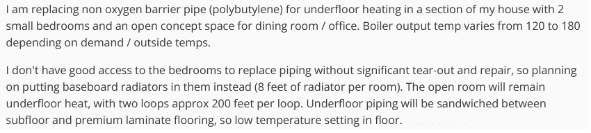 I am replacing non oxygen barrier pipe (polybutylene) for underfloor heating in a section of my house with 2 small bedrooms and an open concept space for dining room / office. Boiler output temp varies from 120 to 180 depending on demand / outside temps.