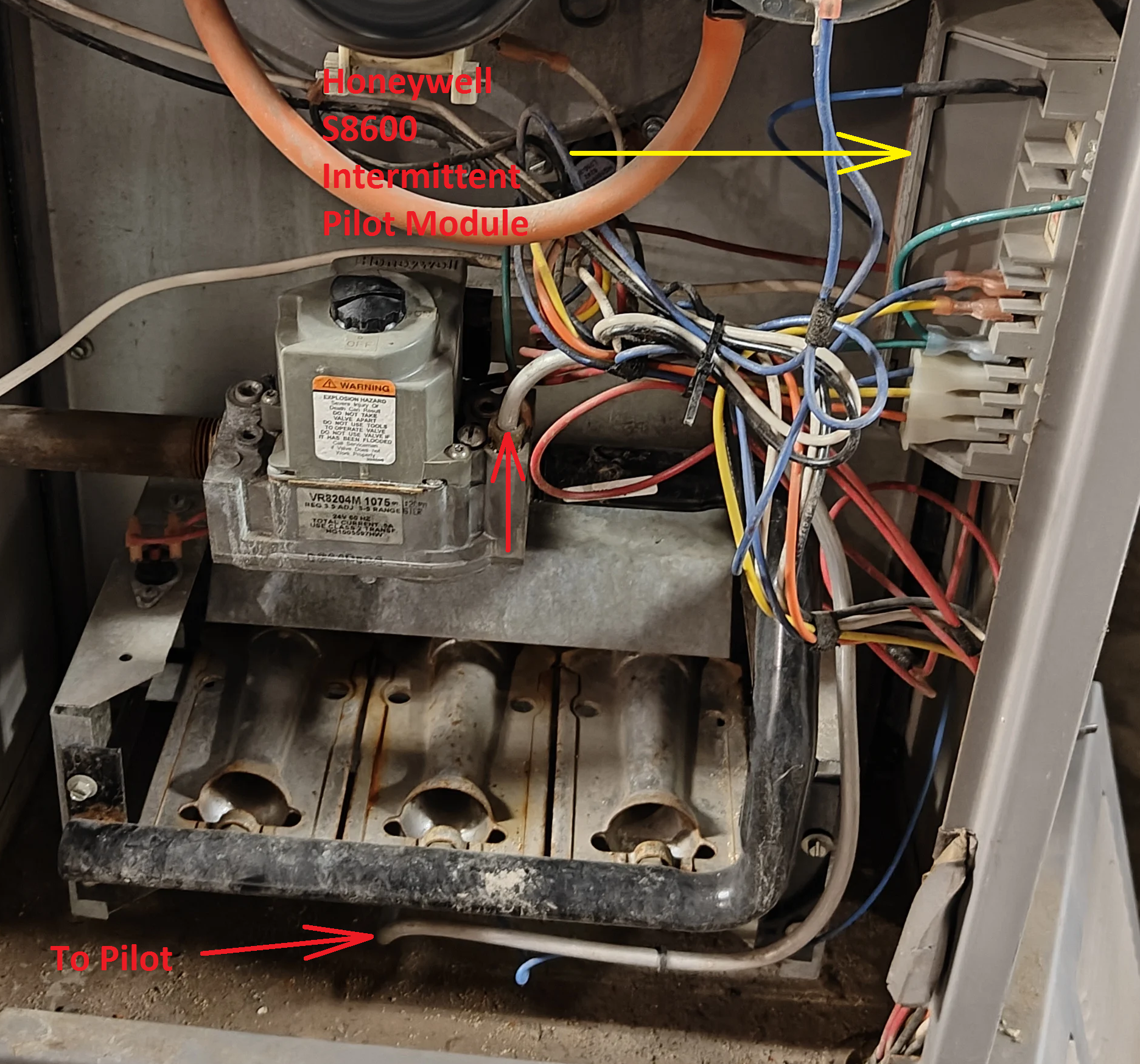 The tube (Red arrows) goes from the Gas valve to the pilot assembly. If the pilot does not light and prove for a period of time the burner will never light. The Blue wire to the Right of the pilot assembly in the picture goes to the igniter / sensor rod at the pilot assembly.