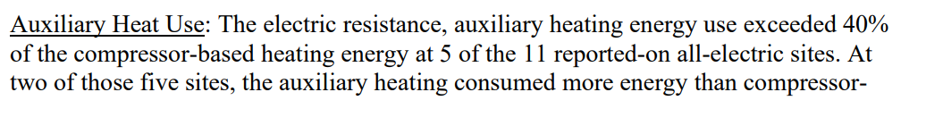 @Kaos , it’s an interesting theory, but per the study: “Most of the all-electric sites had very few hours with outdoor temperatures below the compressor lockout temperature.” This is the maximum outdoor temperature at which the auxiliary heat source operates, so it will not run unless it’s very cold out. The auxiliary heater ran 4.8% of the time on average at these sites.