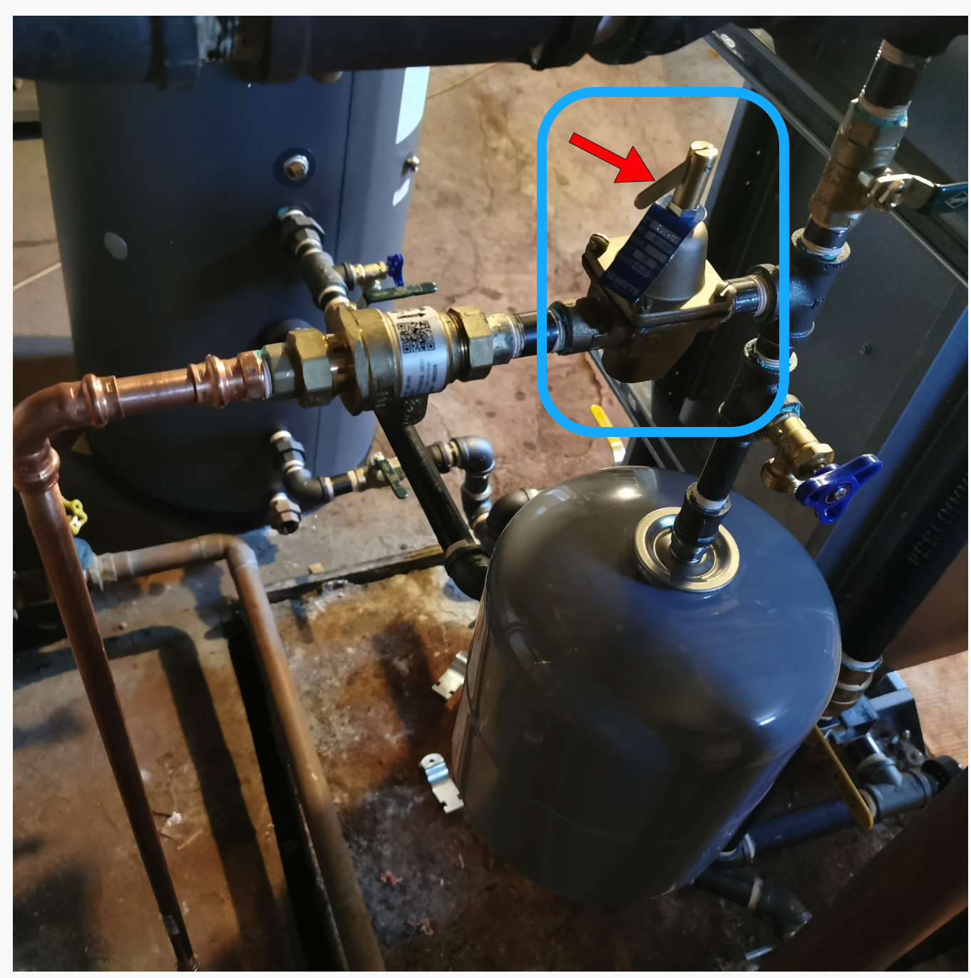 This one? I turned that one open. It was closed for some reason. Then a little while later, I came back to try and repressurize the boiler, only to discover that it was already at its recommended pressure, and I was mistakenly overpressurizing it. Here we are.