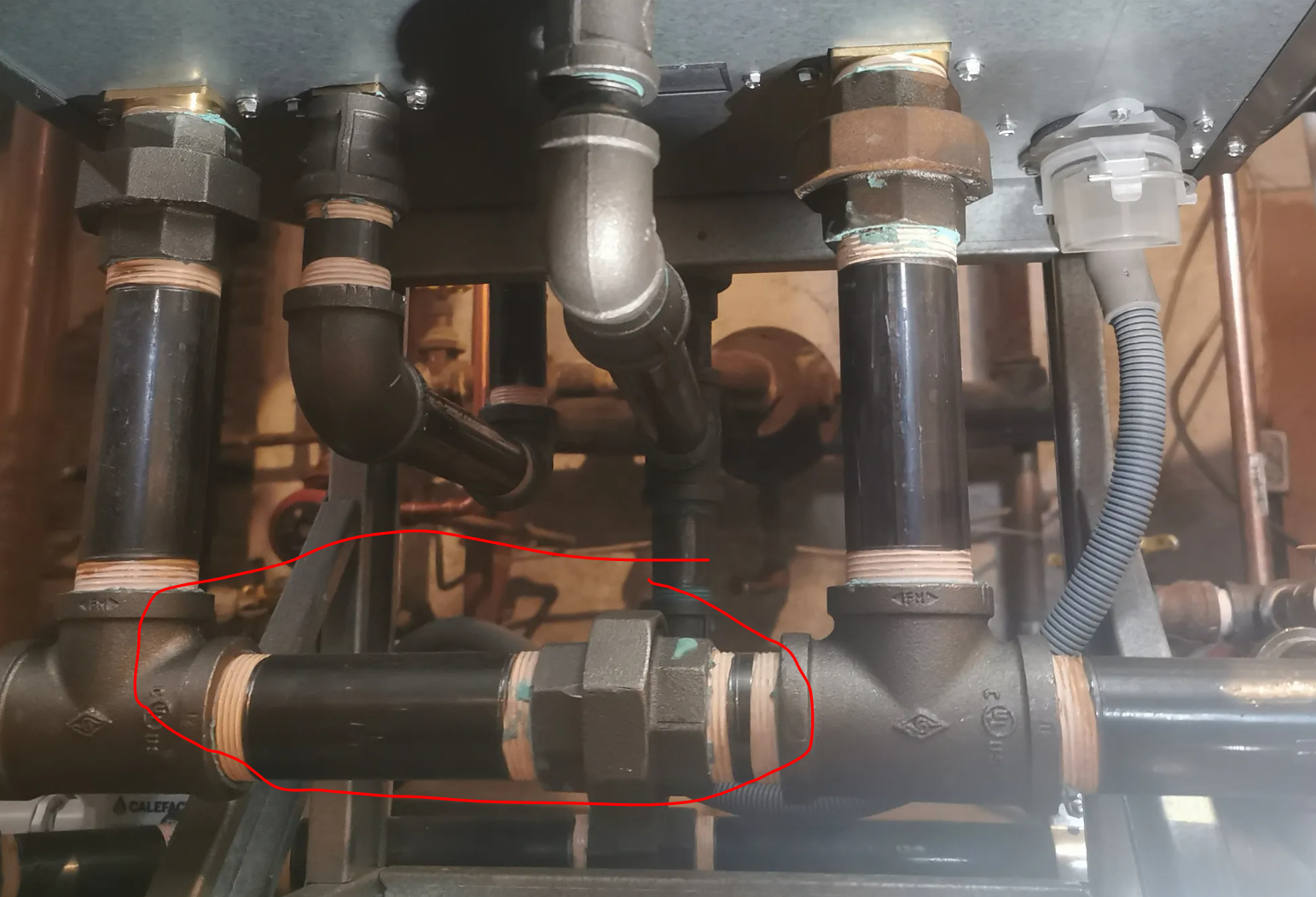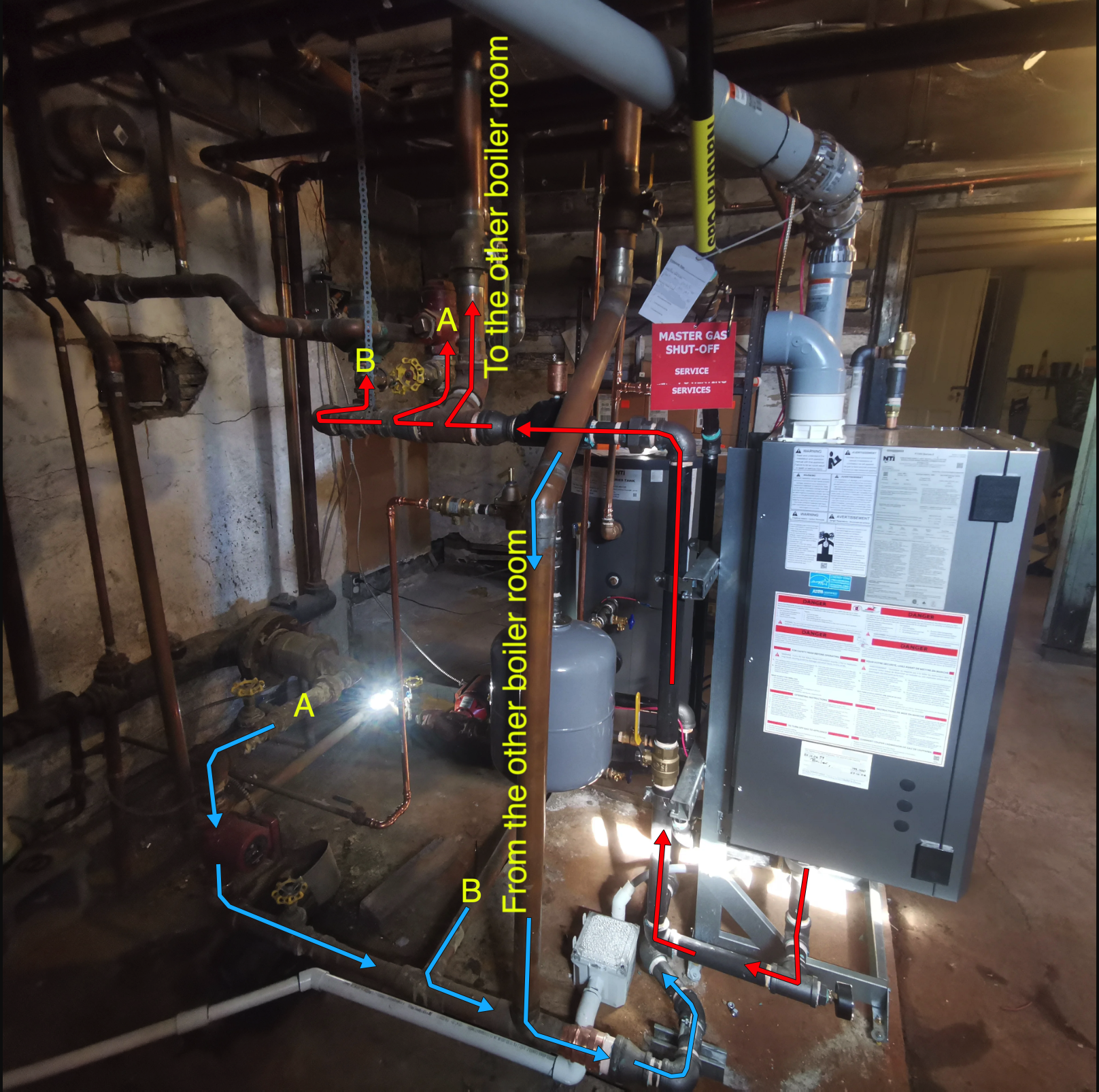 Thanks @Kaos. I did not see that picture. Wow what a difficult way to do the near boiler piping. There are no service valves or purge valves with that black pipe and fittings. So the boiler may be properly piped after all @sjh. I thought I looked at every picture and did not see the Tee fittings that @Kaos just showed in the above picture.