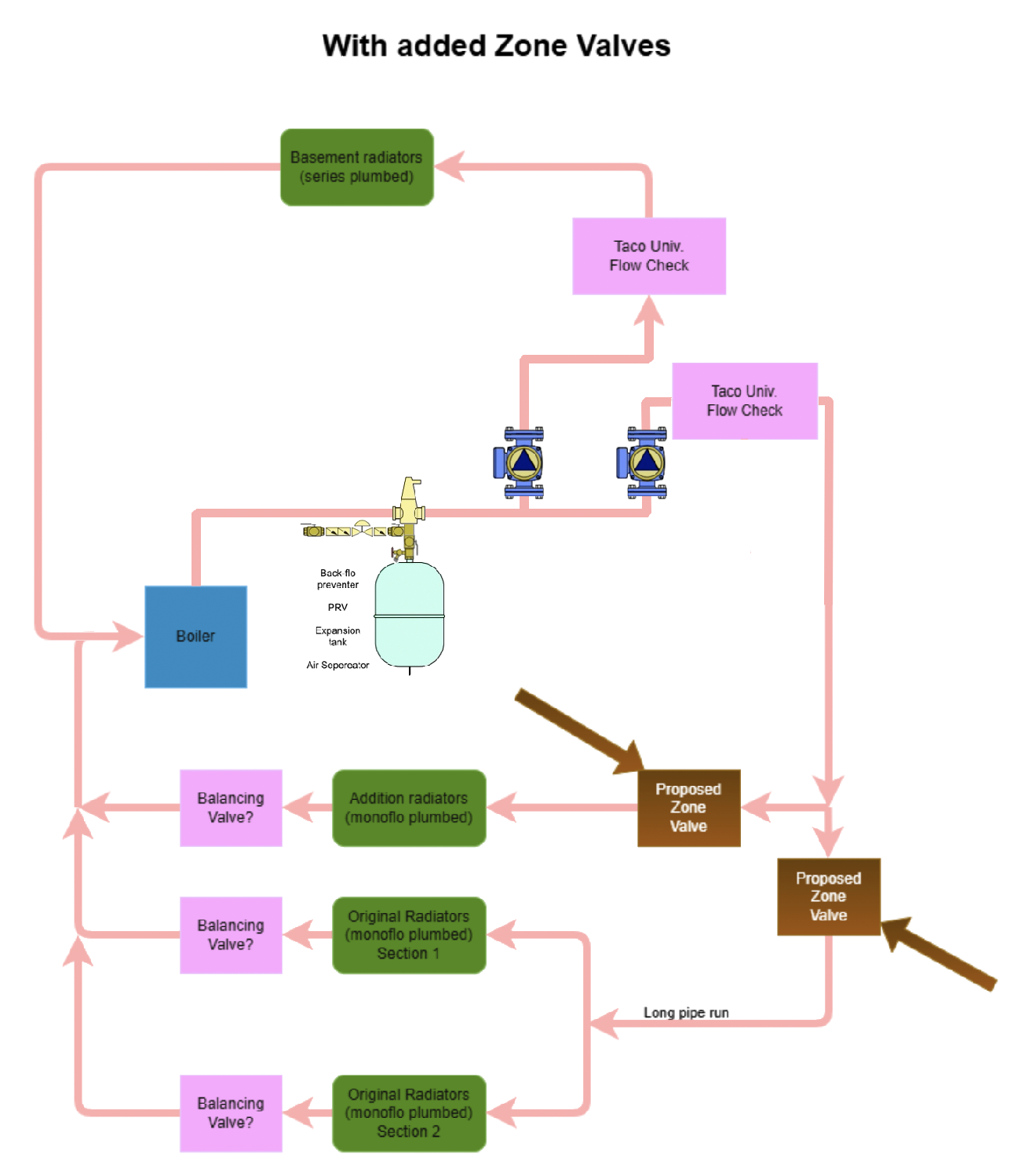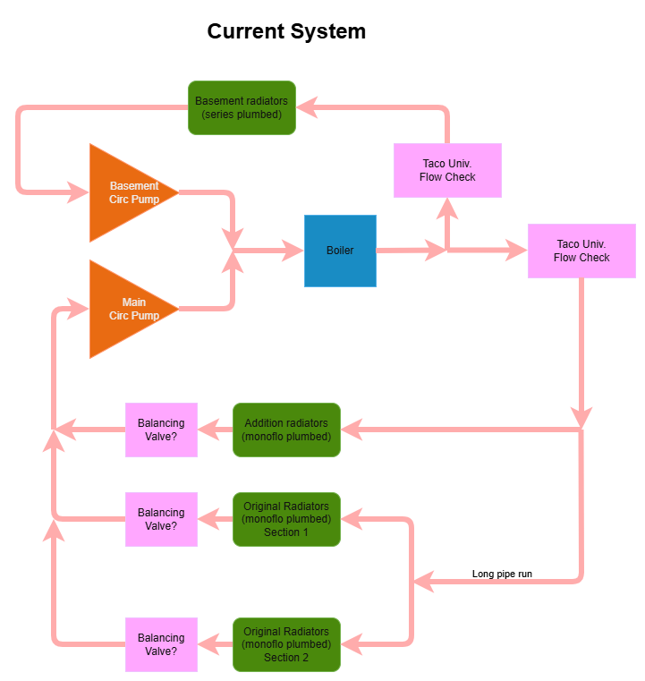 I think that I could add a high Cv zone valve ahead of the addition radiators (White Rodgers 1361-102) and ahead of the "long pipe run" (White Rodgers 1361-104) to the original radiators in order to make the plumbing work for splitting the addition radiators on their own zone.