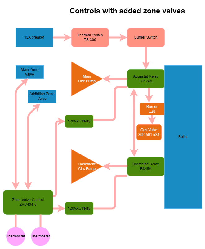Since the basement zone basically never calls for heat, I think that I could do it like this, with a Taco Next Generation Zone Valve Control with Priority. I could put the basement on the priority zone, since it has one thermostat input and one output. I could install the two thermostats for the main house and addition, and send those outputs to the zone valves. Then I could put the circulator pump outputs (priority and zone) to relays which would act the same way as the thermostats do in the current system.