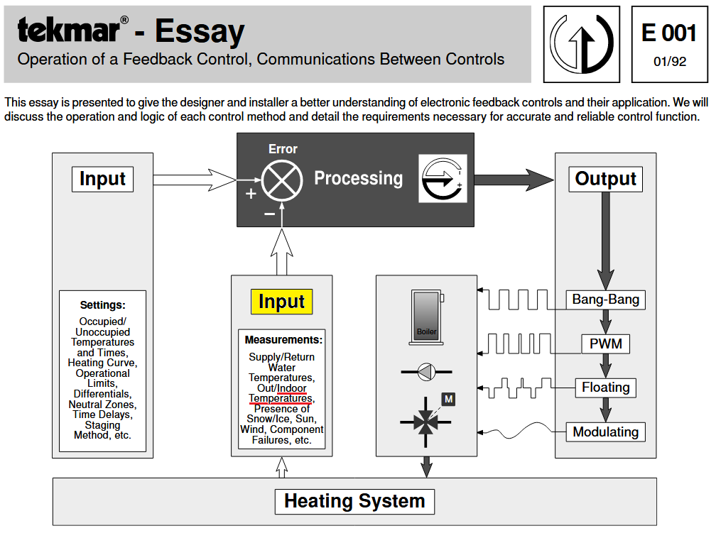 The previous boiler control (which I do not remember, yet used small mechanical inserts that set times, and a knob to set the temp — very easy), was replaced with a Tekmar 256 with outdoor reset and pipe-probe.