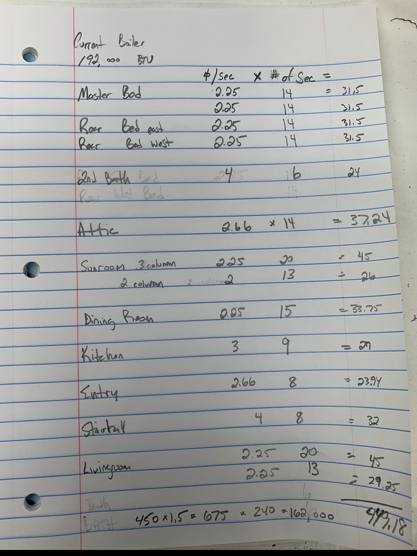 I ran the numbers on boiler size , here they are. Current boiler 192 k btu . My calculation for size is 162 k .
