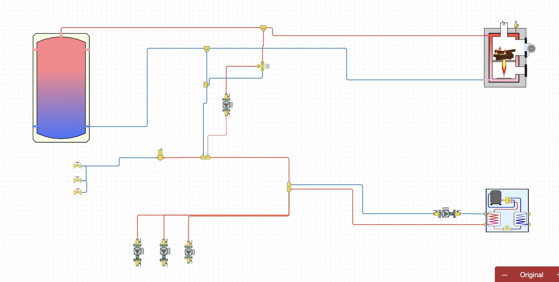 Recently I was asked to put a wood boiler system on to an existing water to water system. The current heat pump works fine, but it was piped into an electric 50 gallon tank. They wanted the tank removed, and this is the final concept. There are actually 3 storage tanks, and a lot of other valves, and miscellaneous items but for you to understand here it is.
