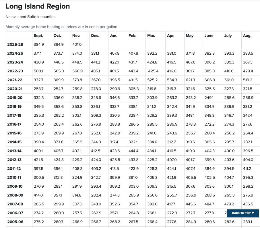The NYSERDA website has historical data on various heating fuel over many years. This shows heating oil costs in you area over a 20 year period.