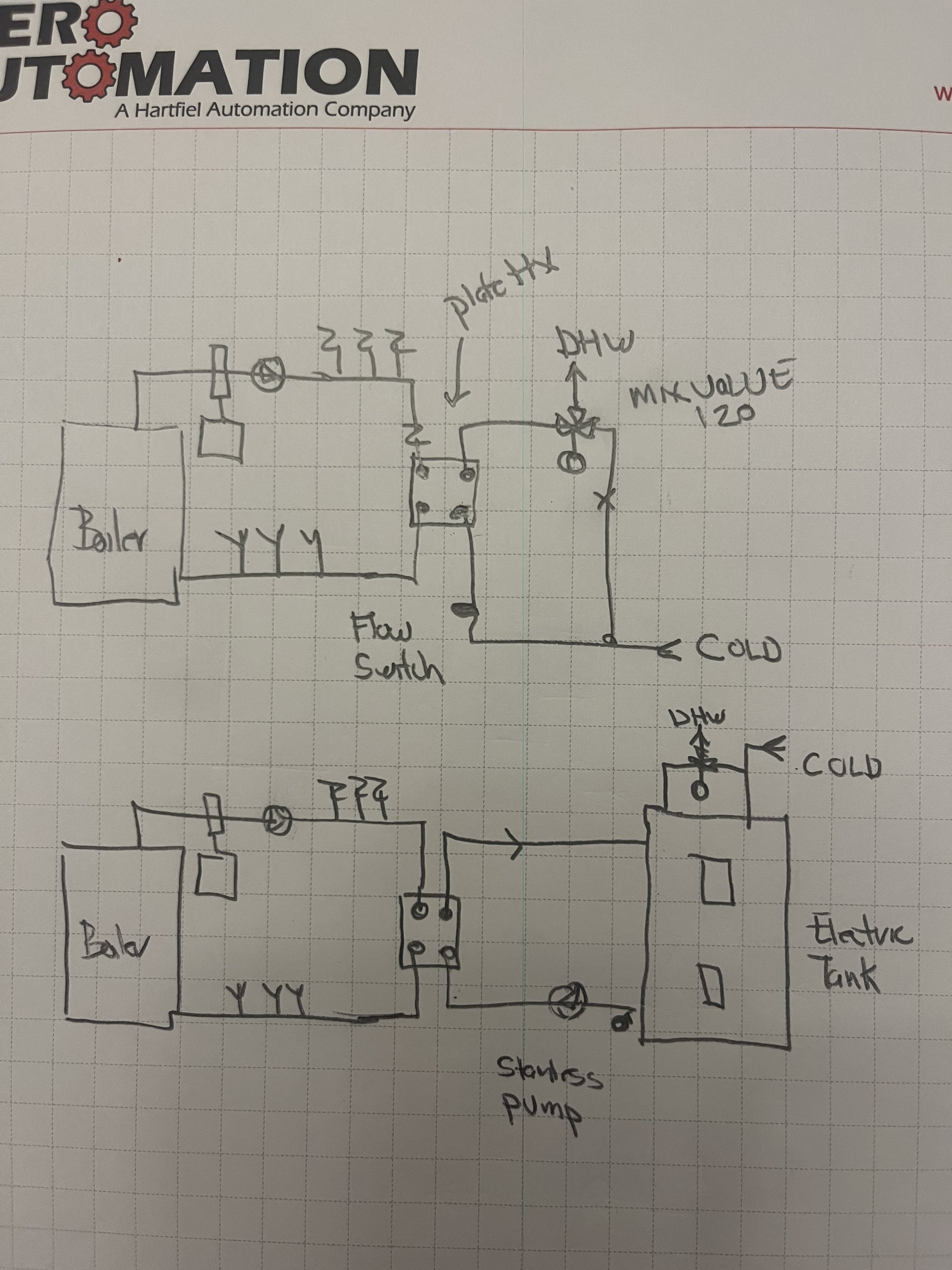 1st is basically a site built combi boiler built with a plate hx. A flow switch turns on the zone valve to heat DHW instantly. This has a bit of lag unless you keep the boiler at 150 or so, same as a combi boiler