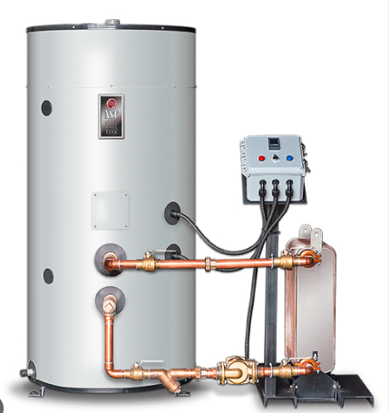 There used to be some tanks pre-built with external plate heat exchangers back when solar was popular.