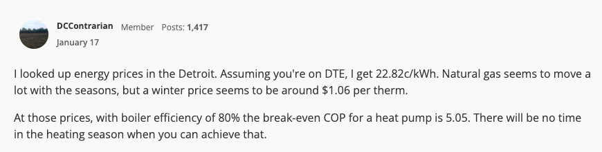 I looked up energy prices in the Detroit. Assuming you're on DTE, I get 22.82c/kWh. Natural gas seems to move a lot with the seasons, but a winter price seems to be around $1.06 per therm.