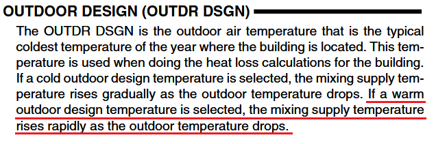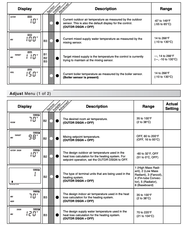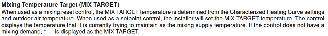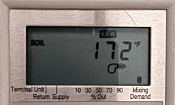 Interesting; Could they be missing the injection circulator activity ? Although I would think it would modulate and not just shut off although if the Mix temperature of the curve has been met it may shut off. It seems here at 23 degrees outside the Mix water temperature is at 137 degrees, that is higher than the earlier 113 degrees and the boiler is active at 172 degrees where before the boiler water was 184 degrees and the boiler was off. Kind of wondering if the Tekmar is basically working just the Variable % part of the display is not.