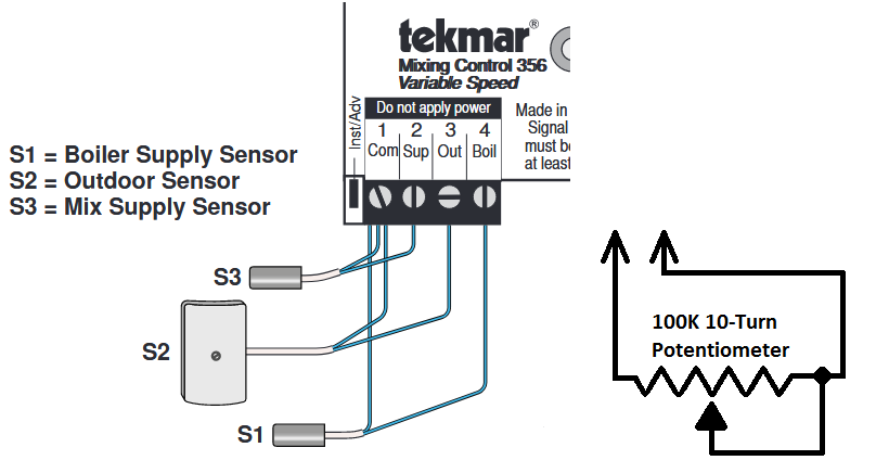 It's all about knowing how you want your simulator to work, its capabilities and knowing the component values to get that accomplished. Simulators can be as simple as a single potentiometer and some clip leads or in the case of the Tekmar 356 using 3 potentiometers since there are three sensors. Features like WWSD can be verified in the winter, outdoor reset can be verified in the summer, Mix and boiler temperature all at the same time without moving things around.