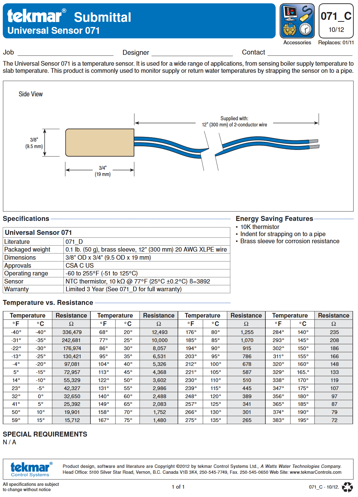 If I was a Tech that wanted to verify the operation of the Tekmar and other like controllers I would have a 100,000 Ohm 10-Turn Potentiometer (-5 degrees to over 383 degrees simulation) and/or a resistor decade box I could substitute for the sensor(s).