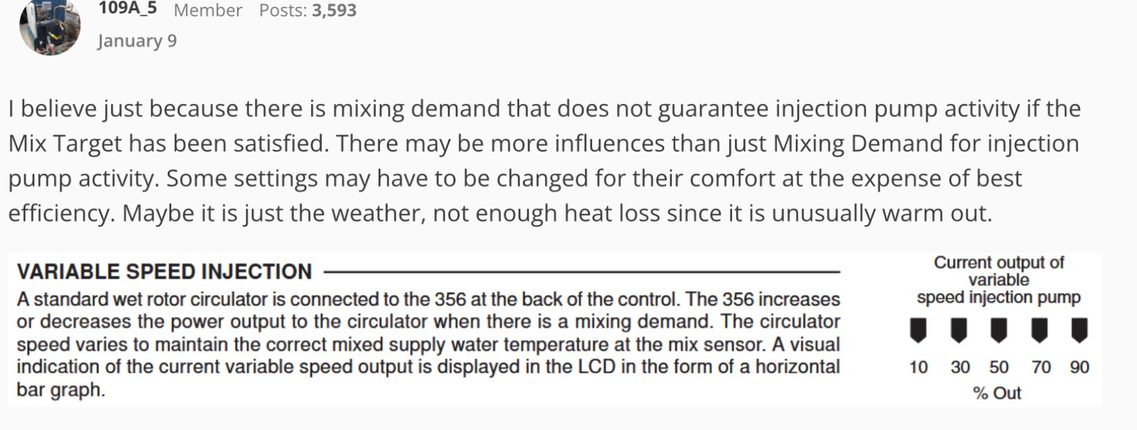 I believe just because there is mixing demand that does not guarantee injection pump activity if the Mix Target has been satisfied. There may be more influences than just Mixing Demand for injection pump activity. Some settings may have to be changed for their comfort at the expense of best efficiency. Maybe it is just the weather, not enough heat loss since it is unusually warm out.