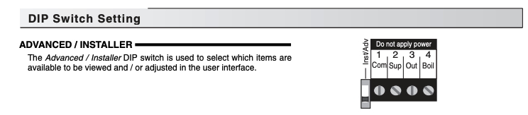 The small DIP (toggle) switch left of the terminal strip is easy to miss, make sure you are in advanced to change settings. The chart below shows what screens are available in Advanced/ Installer mode. Adjust appears in the upper right screen in advanced mode