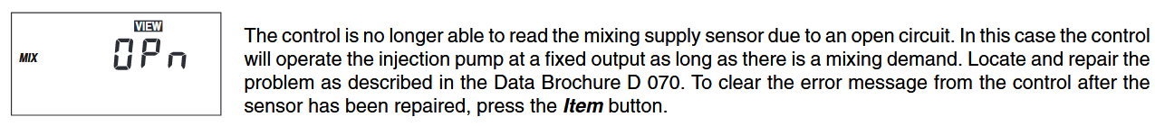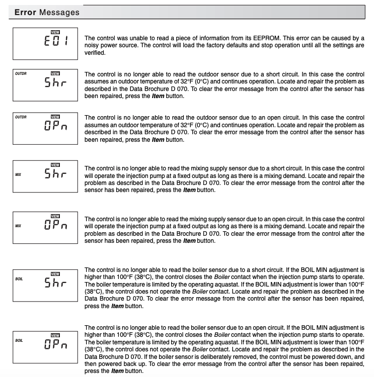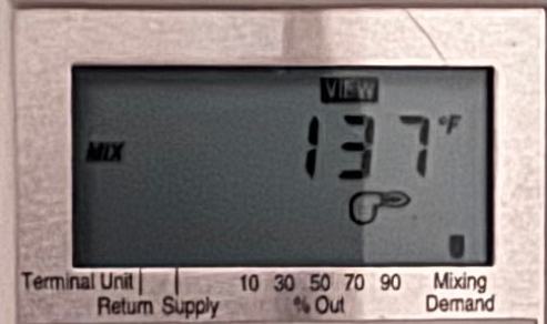 Sorry for the confusion on item #4 in previous post. "Mix" temp was 113. Attached photos sent by customer. Supply mix temp is at default for the terminal units (120). Reset mode sets 113 given the ambient temp? Thermometer on supply pipe going to garage zone reads 89/90. Need to see what sensor actually reads AND must check resistance vs temp on the sensor. Crux of the matter again aside from not enough heat, I have Never seen the injection pump run at ANY percentage, yet on its own.