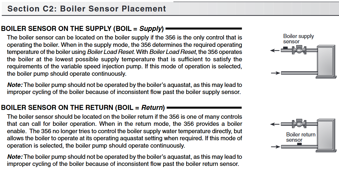 Claimed it worked for 21 years, and then something changed, it was resolved (long story short), the boiler pump was not wired into the system correctly. In this case when the Tekmar 356 sensed the boiler was hot enough it would end the call to the boiler and that would turn off the boiler's circulator. So no more heat to the system until the Boiler Supply sensor cooled enough. Tekmar's note below warns about that situation. In that case the system's drawings helped a lot.