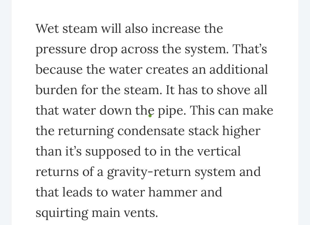 Can wet steam cause issues? Not so much on a residential job but there are situations with process steam that the steam quality is very important. Condensate collected in a sagging pipe will cause water hammer. It will make some of the steam coming down the main to condense when it contacts the cooler condensate. The resulting pressure drop from collapsing steam causes more steam to rush in to fill the vacuum and cause hammer. This is more of a piping problem than a wet steam problem.