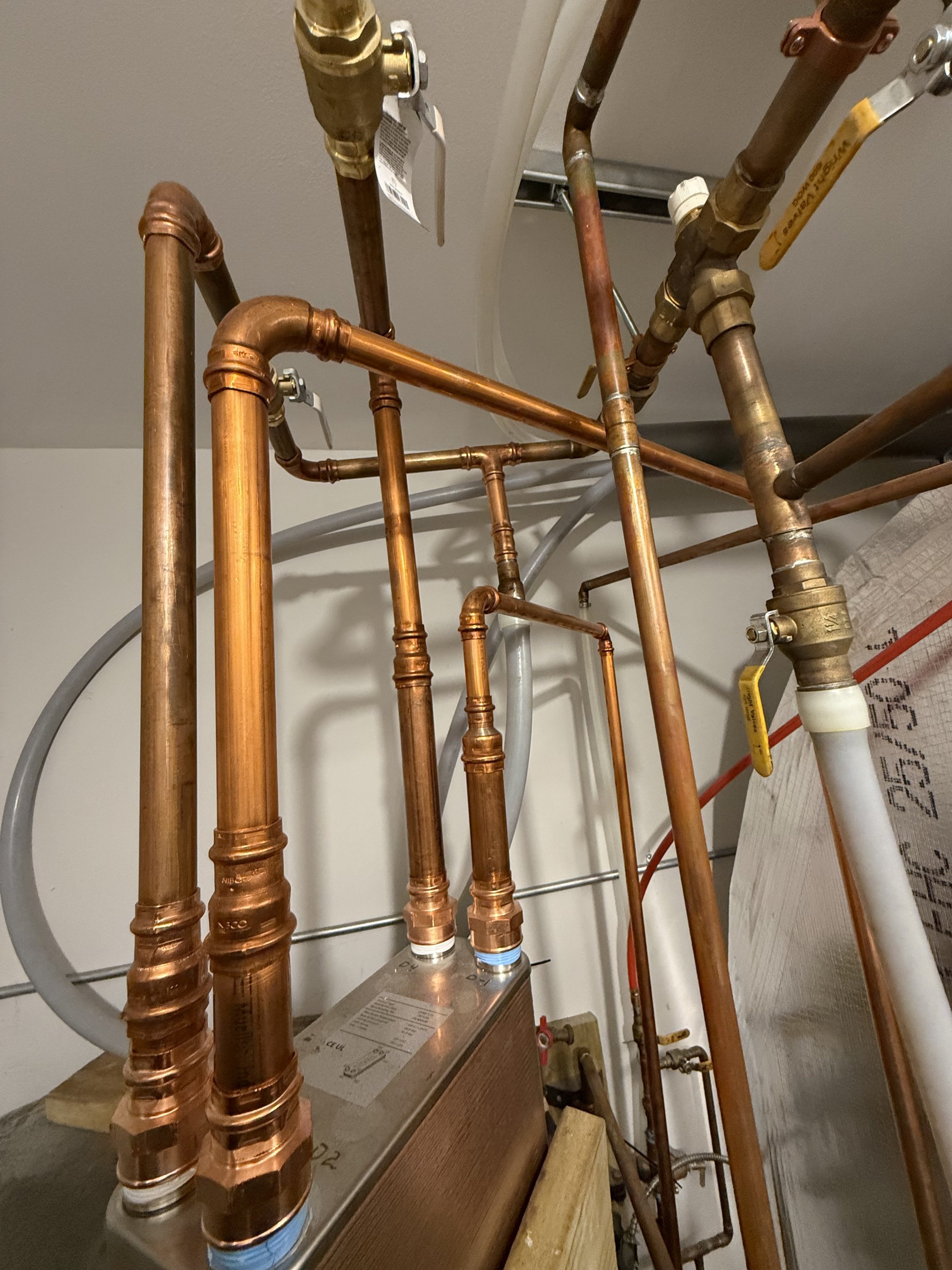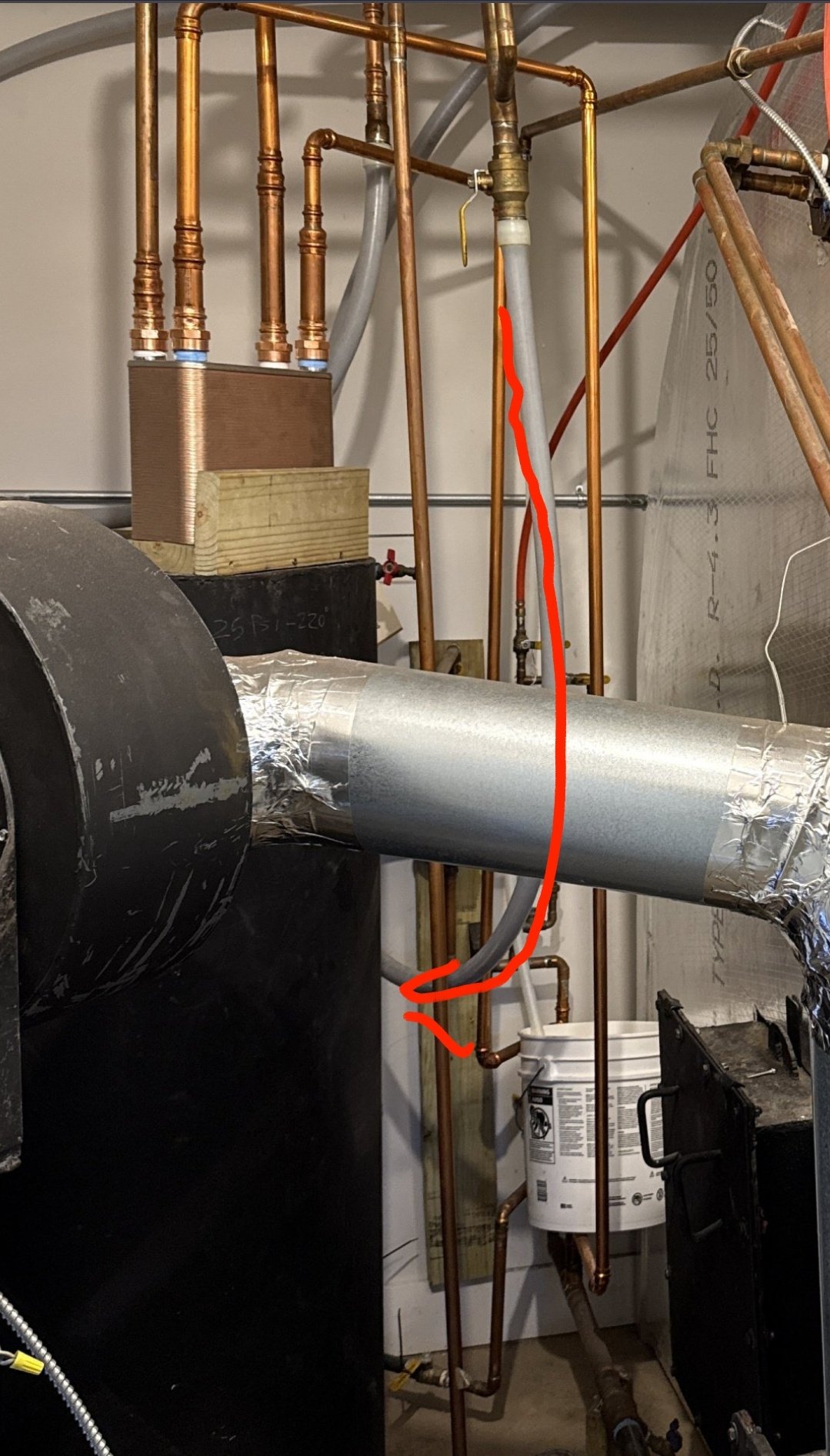 this (attached plans) is missing the heat exchanger. The 100 plate heat exchanger was an after thought because I wanted to separate wood boiler water from propane boiler water (water going through floor).