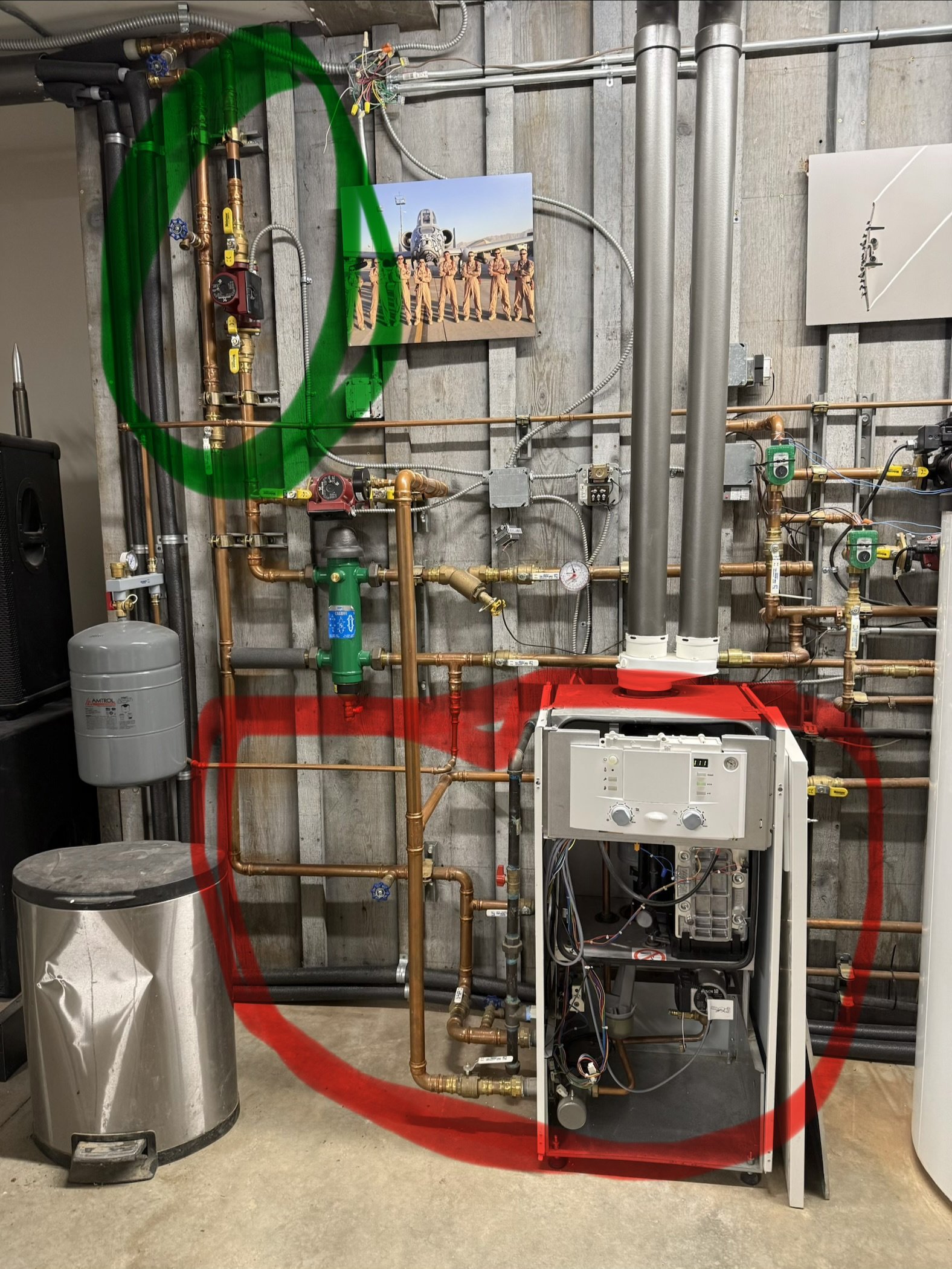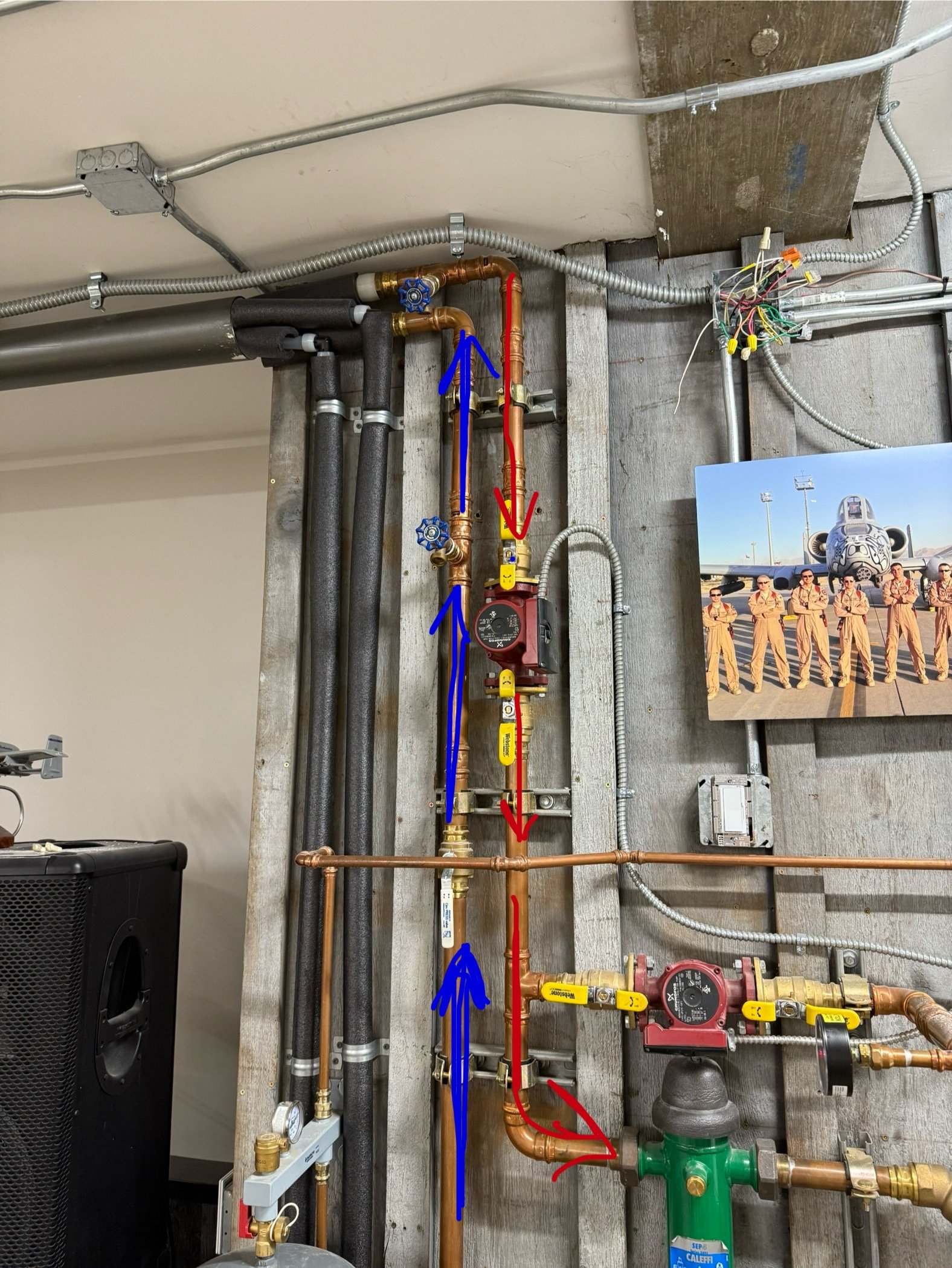 Red lines continued from your drawing - across the room. the pump on the vertical portion of that copper pipe is designed to come on with a call for heat. The pump on the horizontal portion also turns on, and the propane boiler fires up. However, when propane boiler senses the hot water being pumped by the vertical pump, the propane boiler shuts down. Sometimes when the temps are really high on the wood boiler, the residual water stays in that primary side even when the pumps aren’t running and the propane boiler continues to measure that temp. If the temp is higher than what it would fire up to based on the propane boiler setting / dial, then it doesn’t fire up at all with a call for heat and the pumps simply turn on.