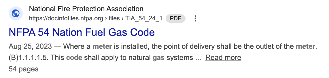 Most all the plumbing/ mechanical code books refer to the NFPA 54 as their code, or a modification of it.