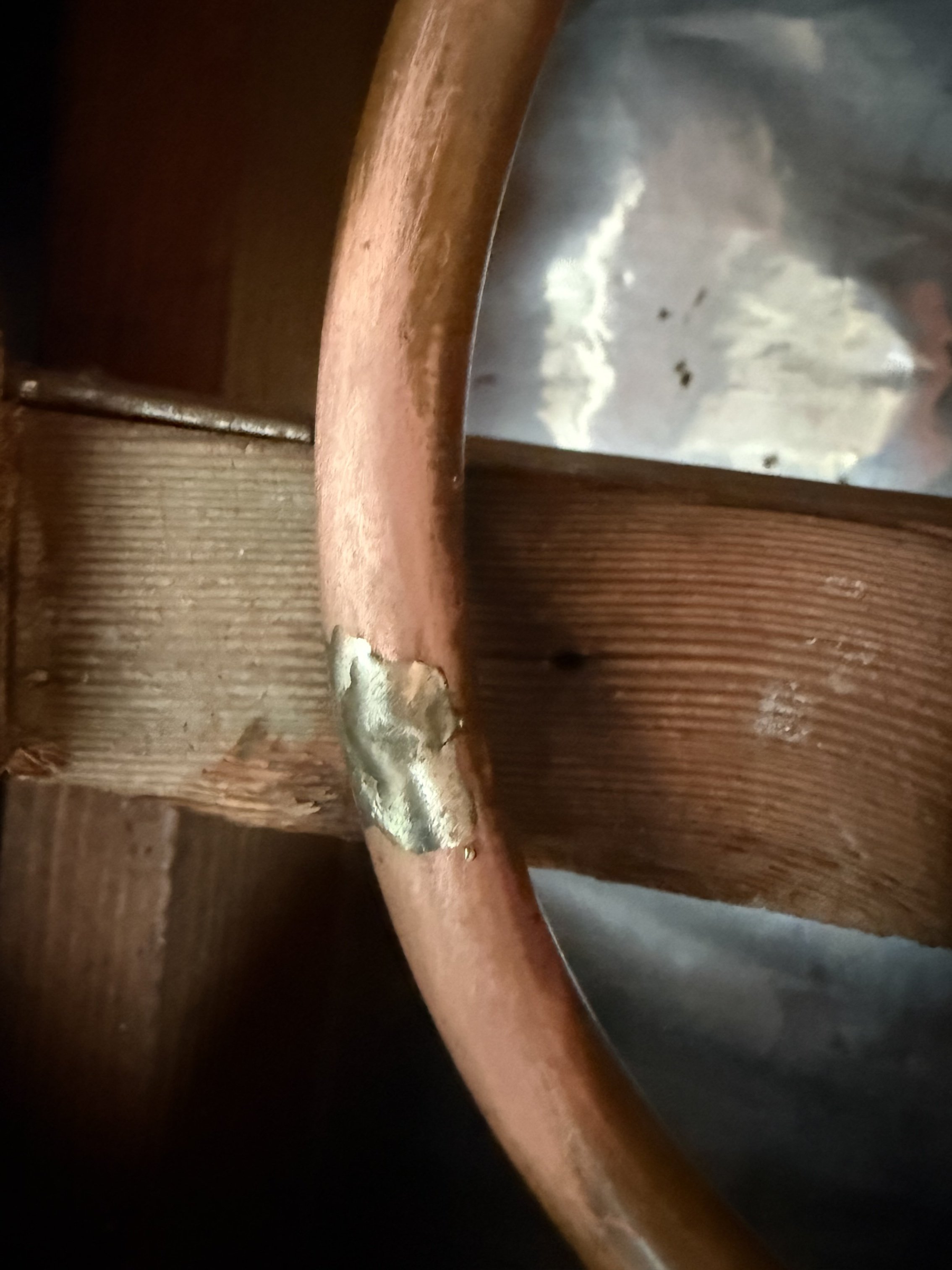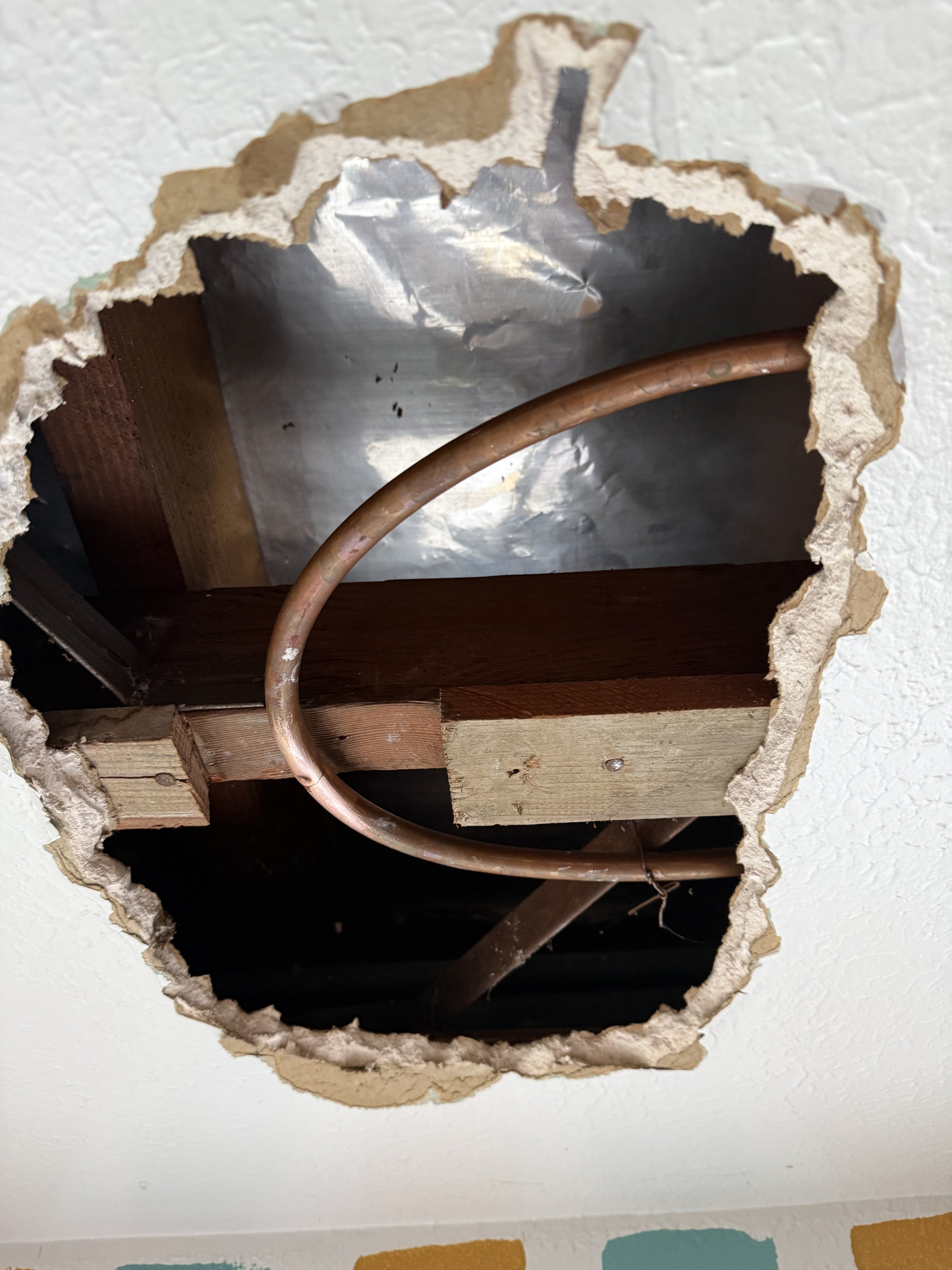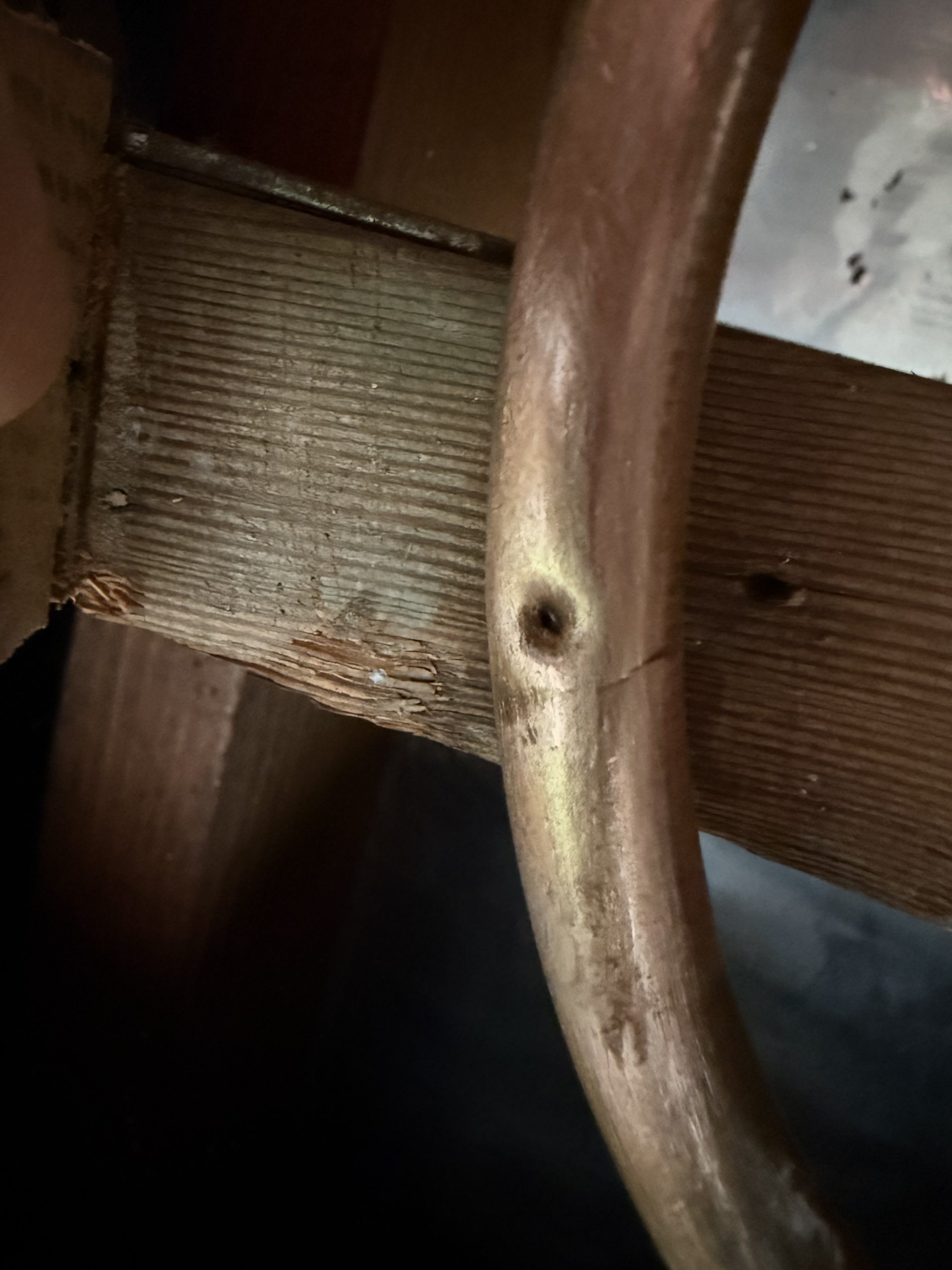 The roofer was a good shot. Probably 5/8" od tubing and he got it right between the eyes. What are the chances. Dead center!!!