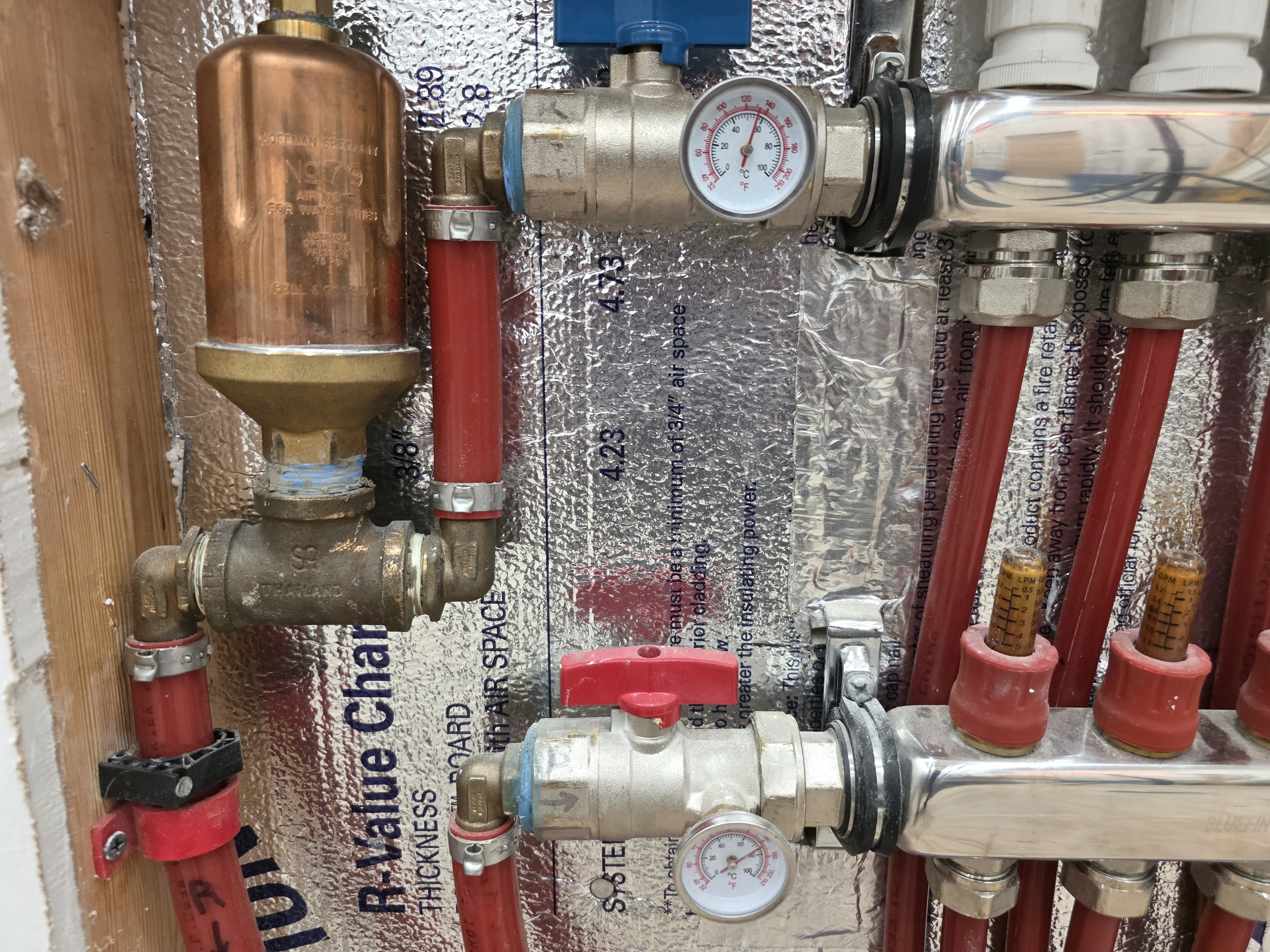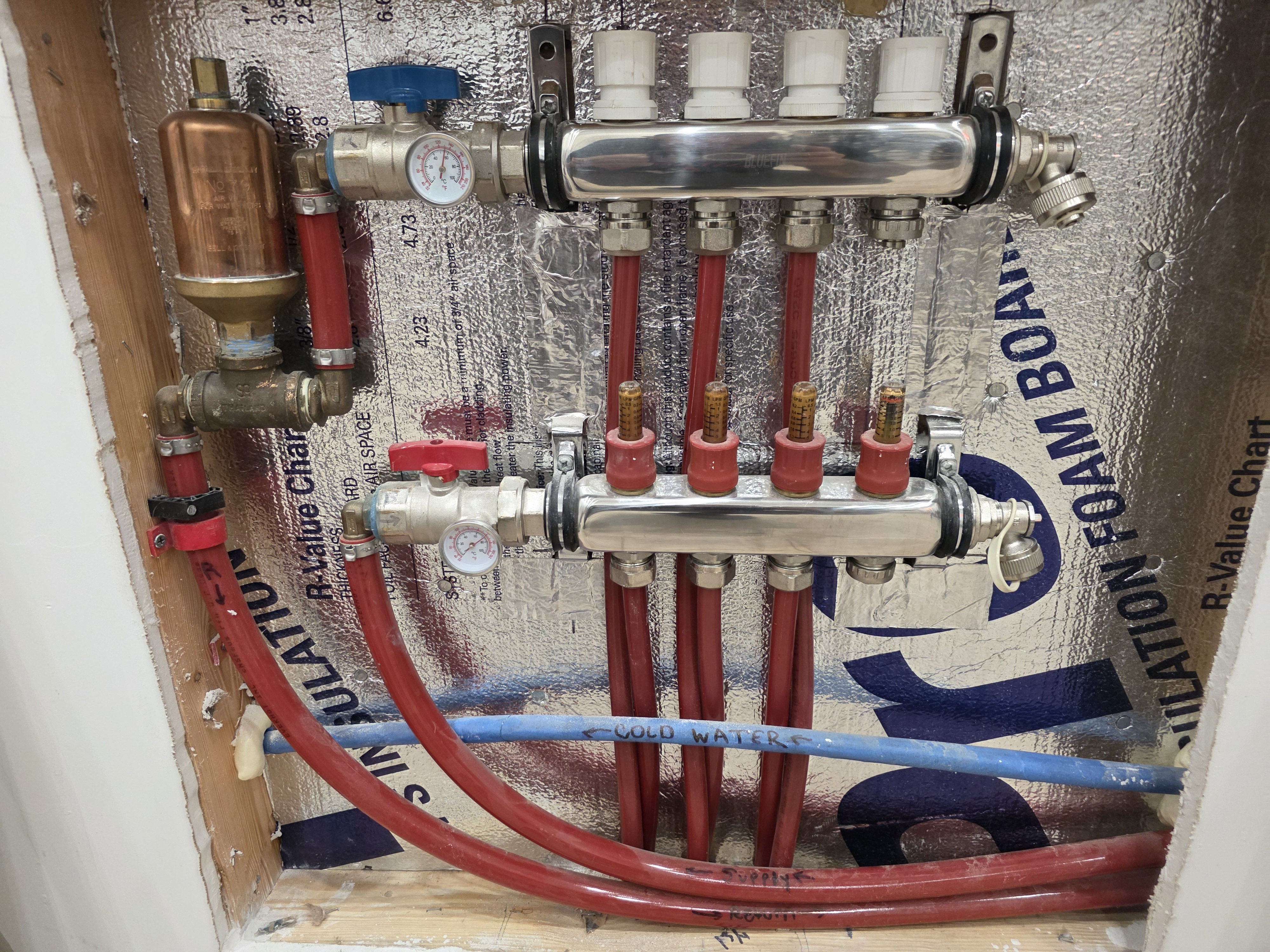 Here is a picture of the manifold, following the removal of the mixing valve. The water temperature is now considerably higher. The water actually reached 180 degrees Fahrenheit on the supply, with approximately 150 degrees Fahrenheit on the return. However, I have not yet observed a significant increase in the floor temperature. I have ordered a thermal imaging camera and am awaiting its arrival so I can obtain some readings of the floor temperature.