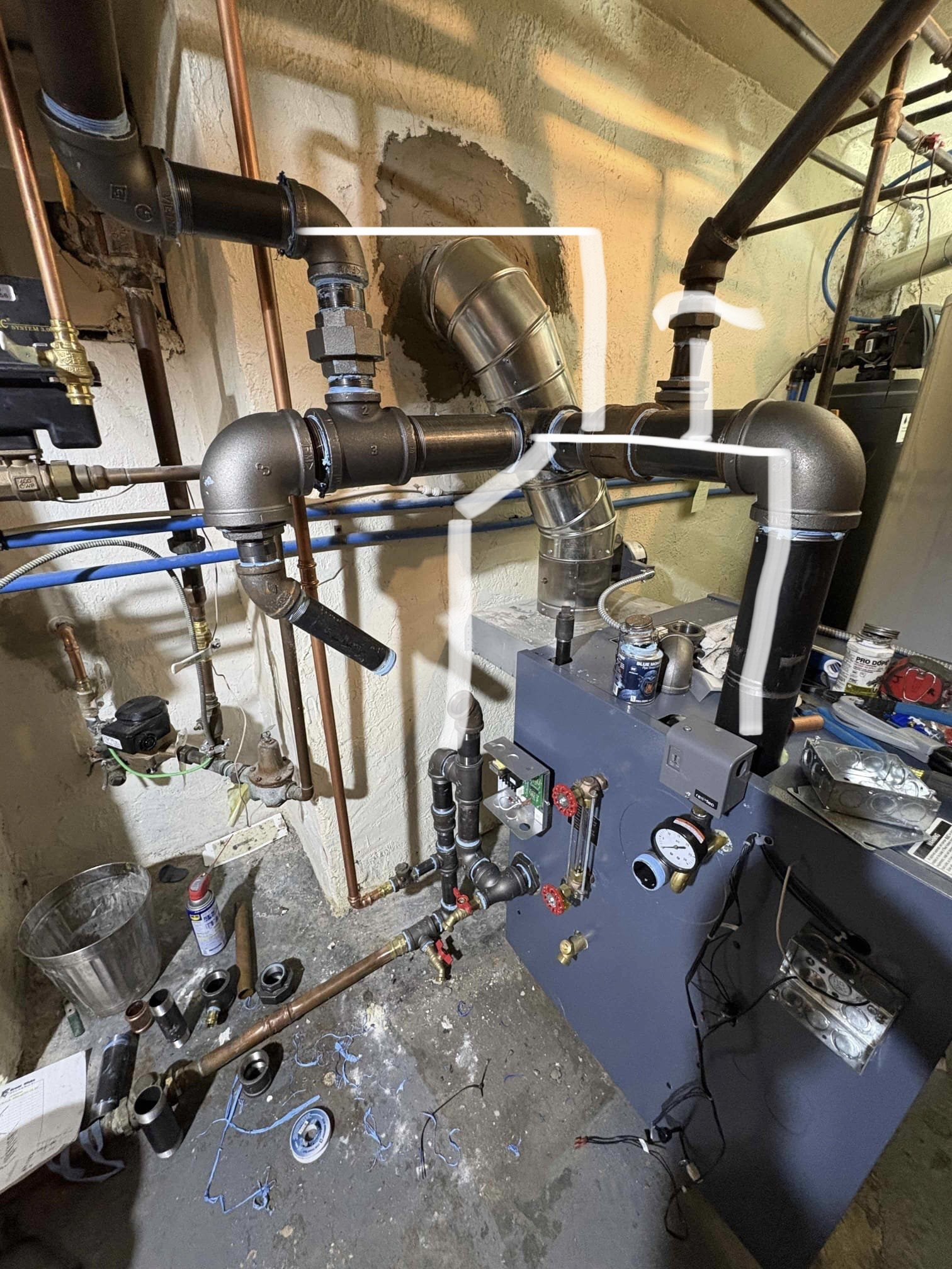 just my 2 cents, not sure if you have the space on that run for 2 tees but would look much cleaner. & can me please cover and protect the top of the boiler, it’s not a work bench lol
