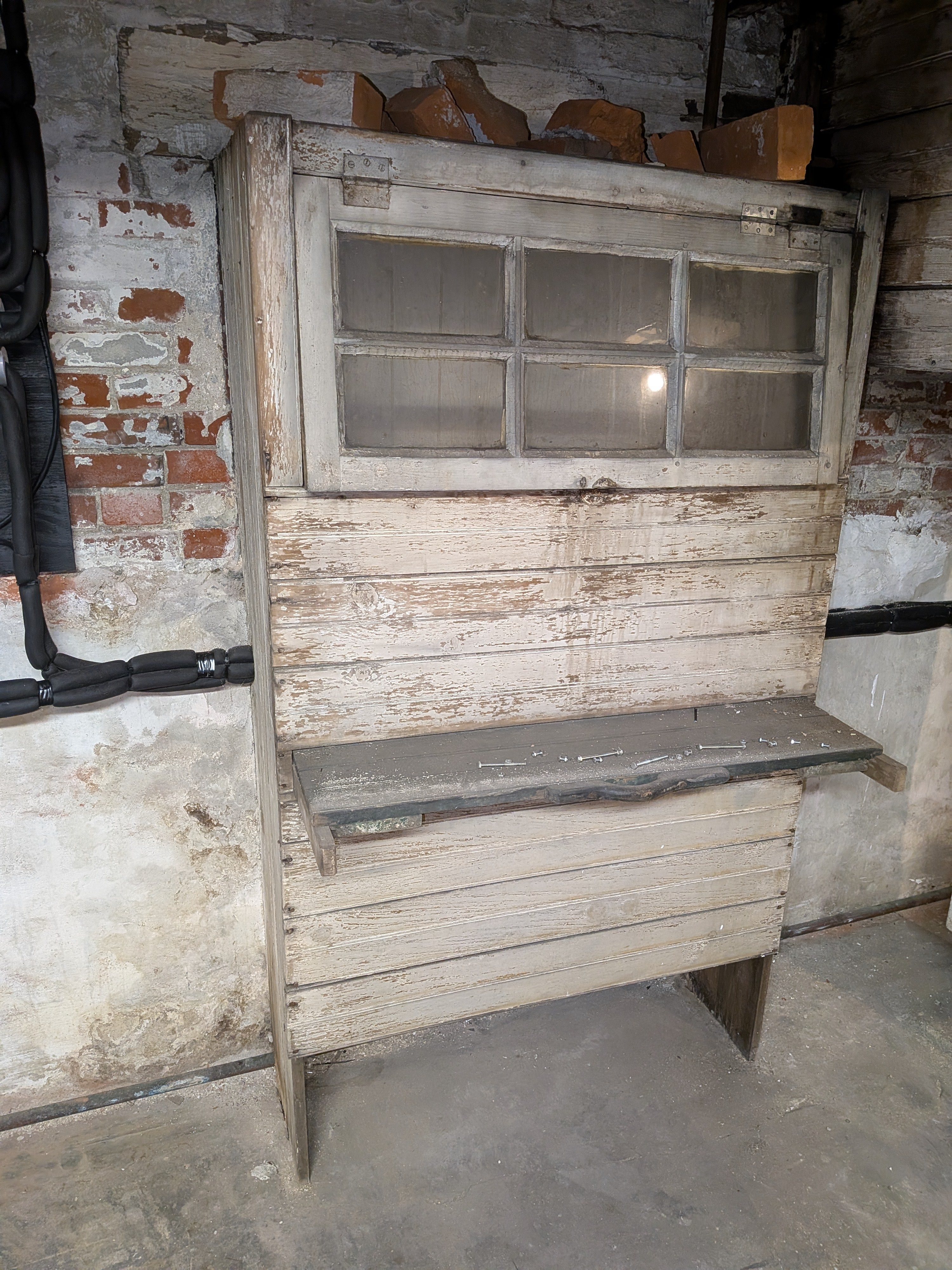 It took me a while to figure it out, but this appears to be the original outdoor air intake for the system. The area behind the window is boarded up now, but it would have been a window back in the day. I'm told there was no "exhaust" at the top of the house, because it was just assumed the heat would leak out via windows, attic, etc. Obviously, it's much less efficient to heat colder outdoor air and just let it leak out. I'm thinking maybe adding a louvered section to my basement door may be enough to get the return needed?