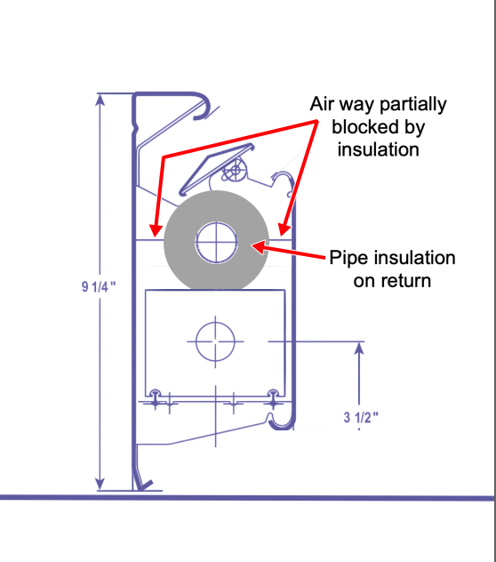 Assuming that the diagram is for real, I can't think of a better way to kill the heat output of those baseboards. I wouldn't care to estimate the output loss, but I'd guess at least 75% loss.