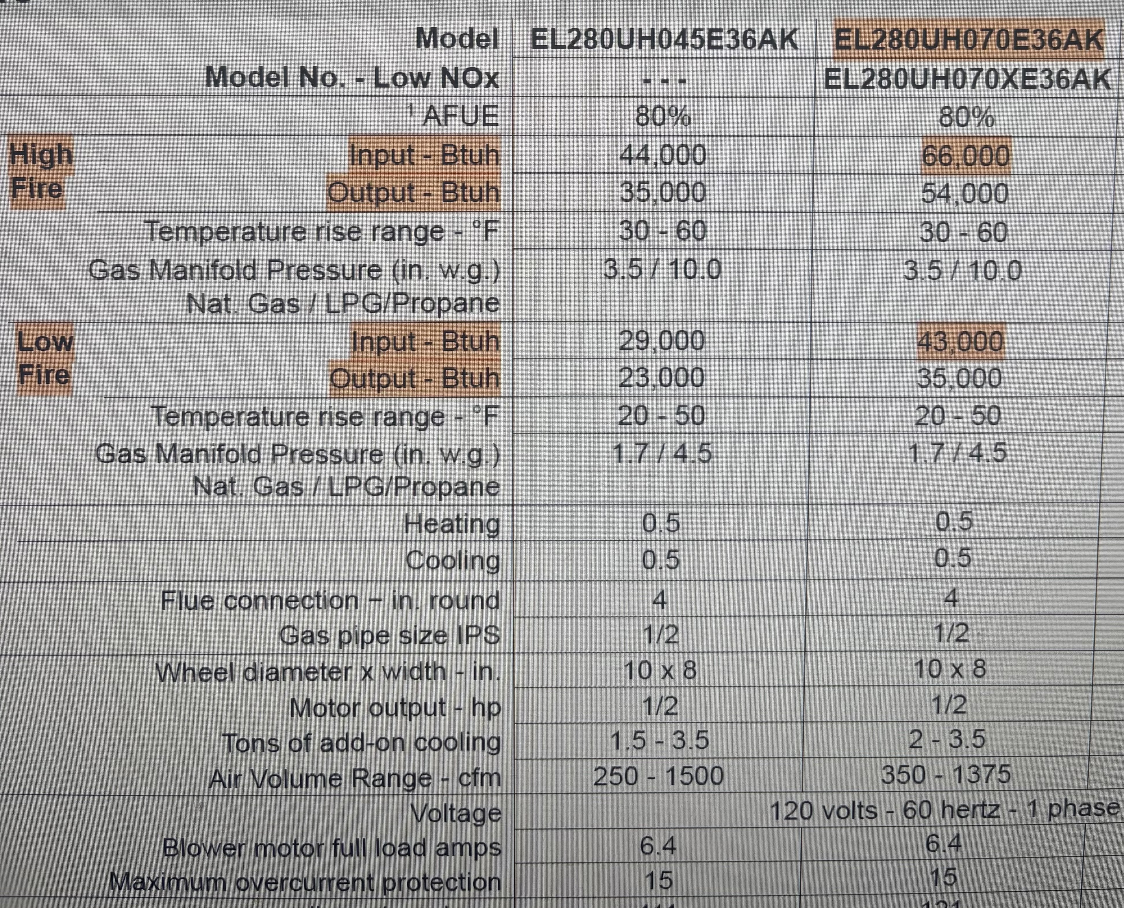 I am looking at Lennox ML180EK 66,000 BTU and EL280EK 88,000 BTU models.