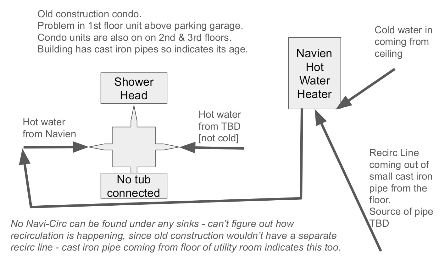 2. The Navien water heater was installed a few years ago and has a water recirculation line connected to a cast iron pipe. Because of the old construction it wouldn't have a separate recirculation line so I went looking for the Navi-circ valve, that would temporarily reuse the cold water line, but I couldn't find it. So I have no idea what that recirculation line is connected to. Perhaps the installation of the Navien made the shower situation worse but the historical experience with it is unclear since it is the guest shower.