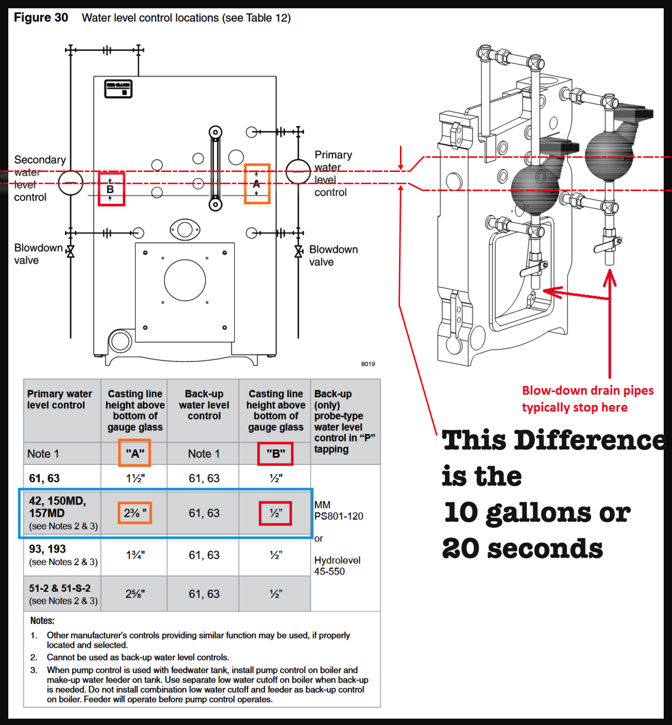 Hey folks. Is there a standard for the height difference between a primary and emergency lwco? When our boiler was installed we were having issues with surging tripping the primary cutout. Rather than addressing water quality issues that were likely causing the problem, our contractor simply raised the primary cutout but not the emergency. As a result it takes about 20 seconds for the emergency cutout to trip when doing a blowdown leading to excessive fresh water being taken on.